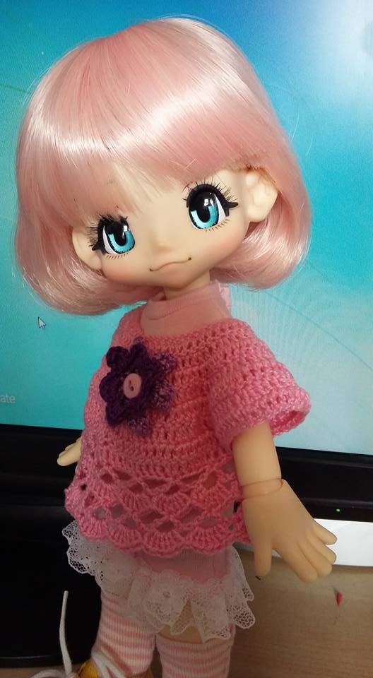 Azone Kiki Pop crochet pink cardigan. Lovely little cardi that i have taken from a baby pattern in four ply and then reduced down into 1 ply, I also added the little flower